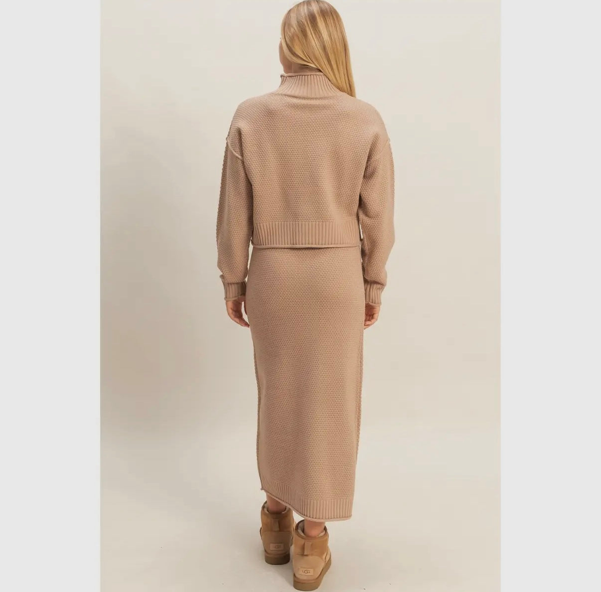 This adorable set is perfect for the cooler days! The high neck sweater with the long skirt offers both comfort and style.